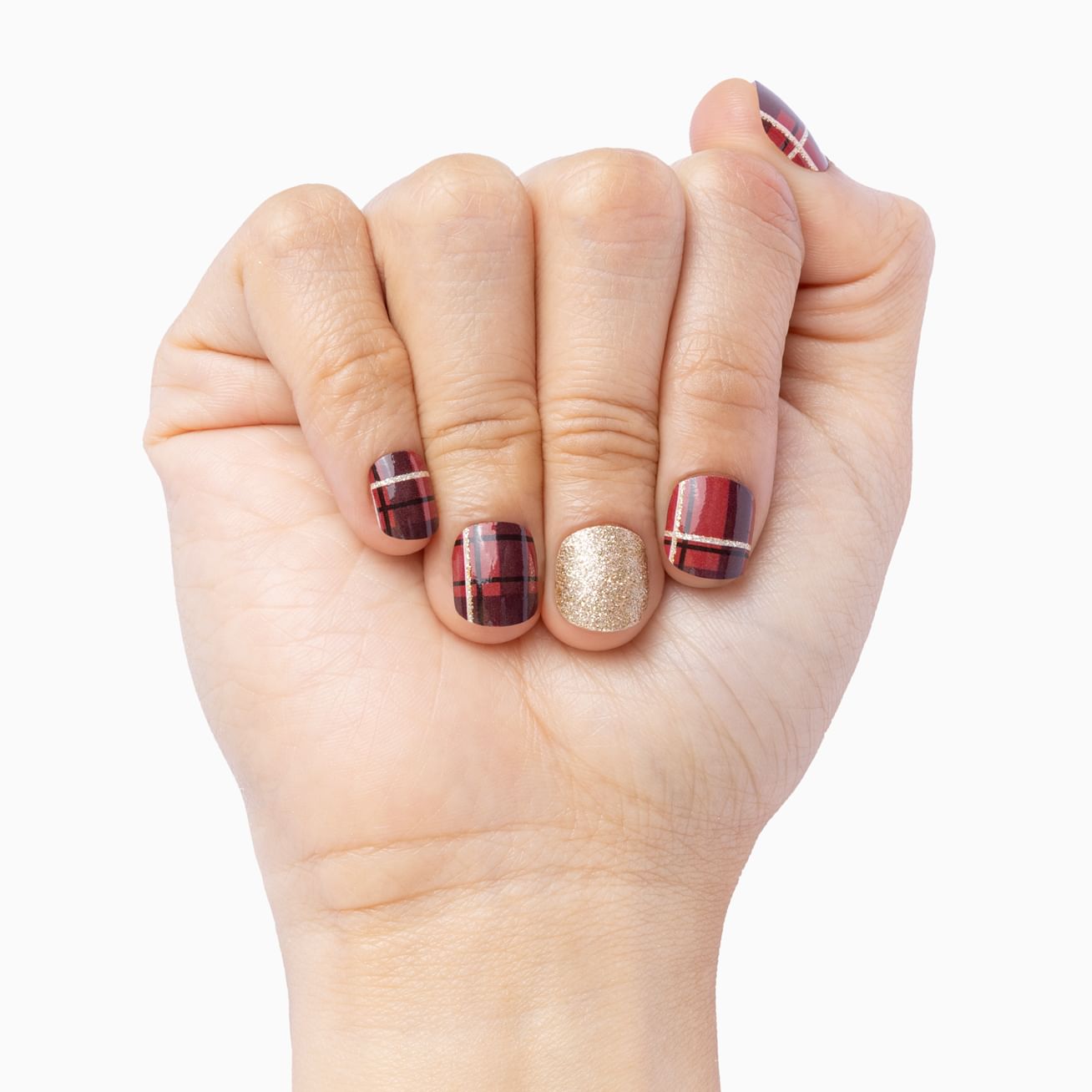 Golden Greetings is one of most popular holiday designs featuring a classic red and black plaid striped with gold glitter complemented by solid gold glitter wraps. Keep this look under wraps by adding a layer of protective top coat.