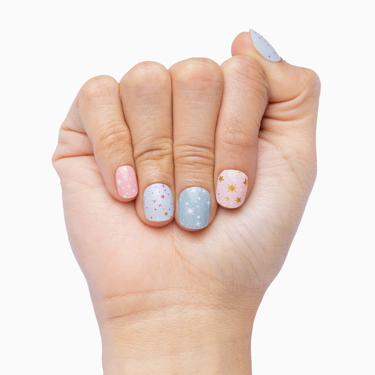 How I wonder why you're reading the description and not just adding this star-studded wrap to your cart already! This beautiful pastel set features glossy blue, turquoise, light pink, and medium pink wraps covered with white, magenta, and metallic gold stars. Keep the magic alive by adding a layer of top coat.