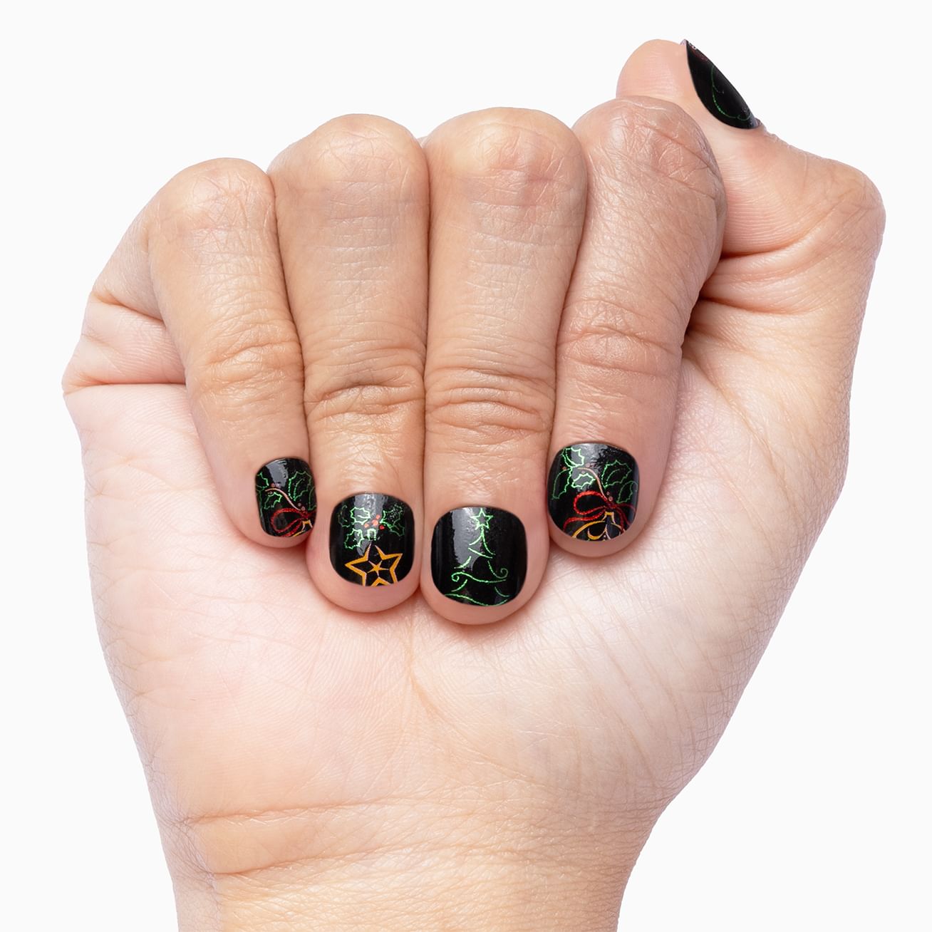Merry and Bright features jaunty Christmas scenes with Santa, ornaments, and a tree decked out in metallic red and green against a glossy, black background. This dramatic manicure is perfect for longer nails, but Santa won't put you on the naughty list for snipping at his toes. Add a layer of top coat to extend the staying power of this shiny mani.