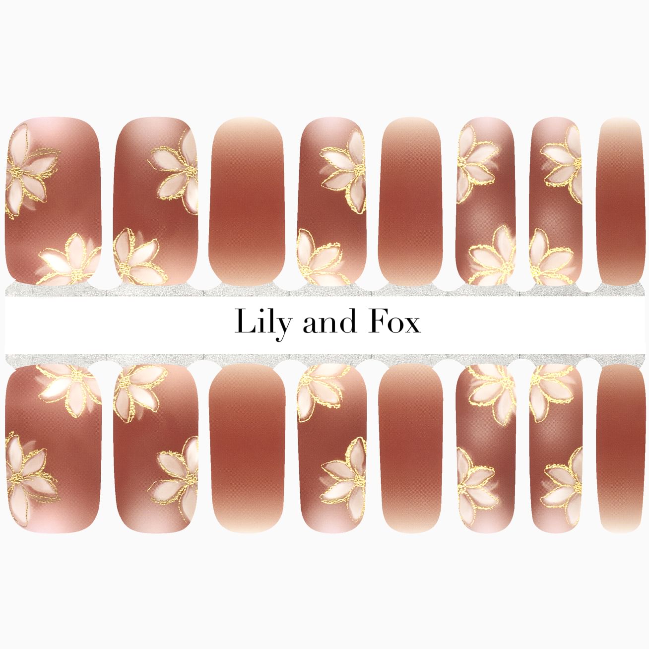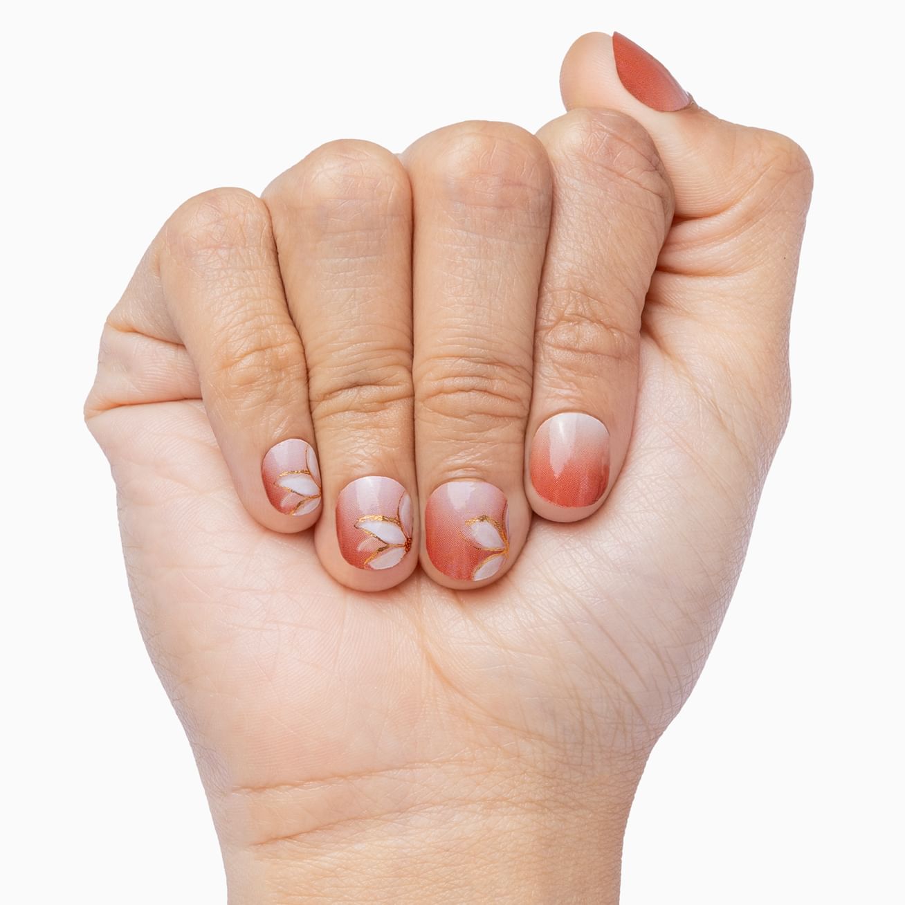 Gilded Petals is a golden delight with pale pink flowers that look hand-painted outlined in metallic gold against a glossy white to warm salmon pink ombré. The placement of the flowers against the cuticle is perfect for a peek of petal on short nails and additional floral arrangement on long nails. Protect this precious look with a layer of top coat.