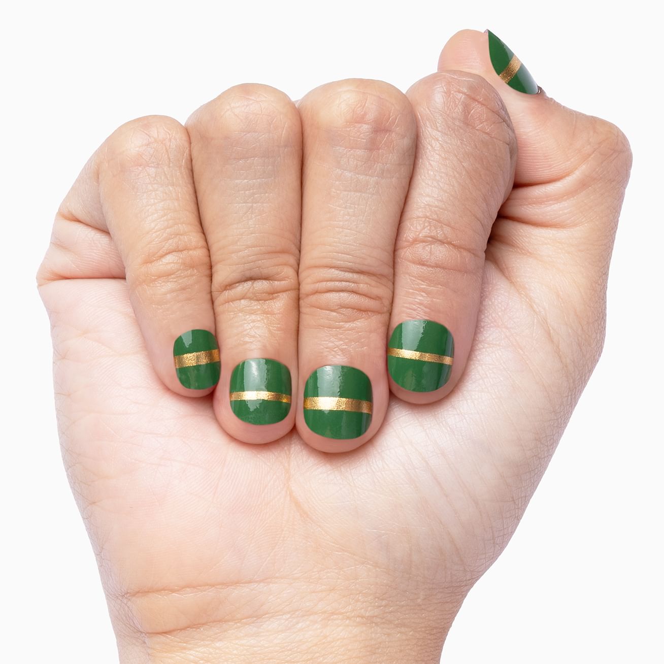 Forest Luxe features a glossy, forest-green background with gold glitter stripe just above the cuticle, perfect for short or long nails. Keep this luxe look golden by adding a layer of top coat.