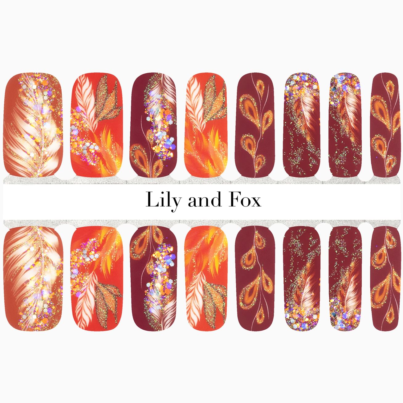 Golden Embers features a range of rich, warm reds, oranges, and golds against a glossy background. The feathery, fiery designs are accented with both iridescent fine and big glitter. Flip this design upside down on some nails for a completely custom manicure. You're fire! Protect the manicure with a layer of top coat.