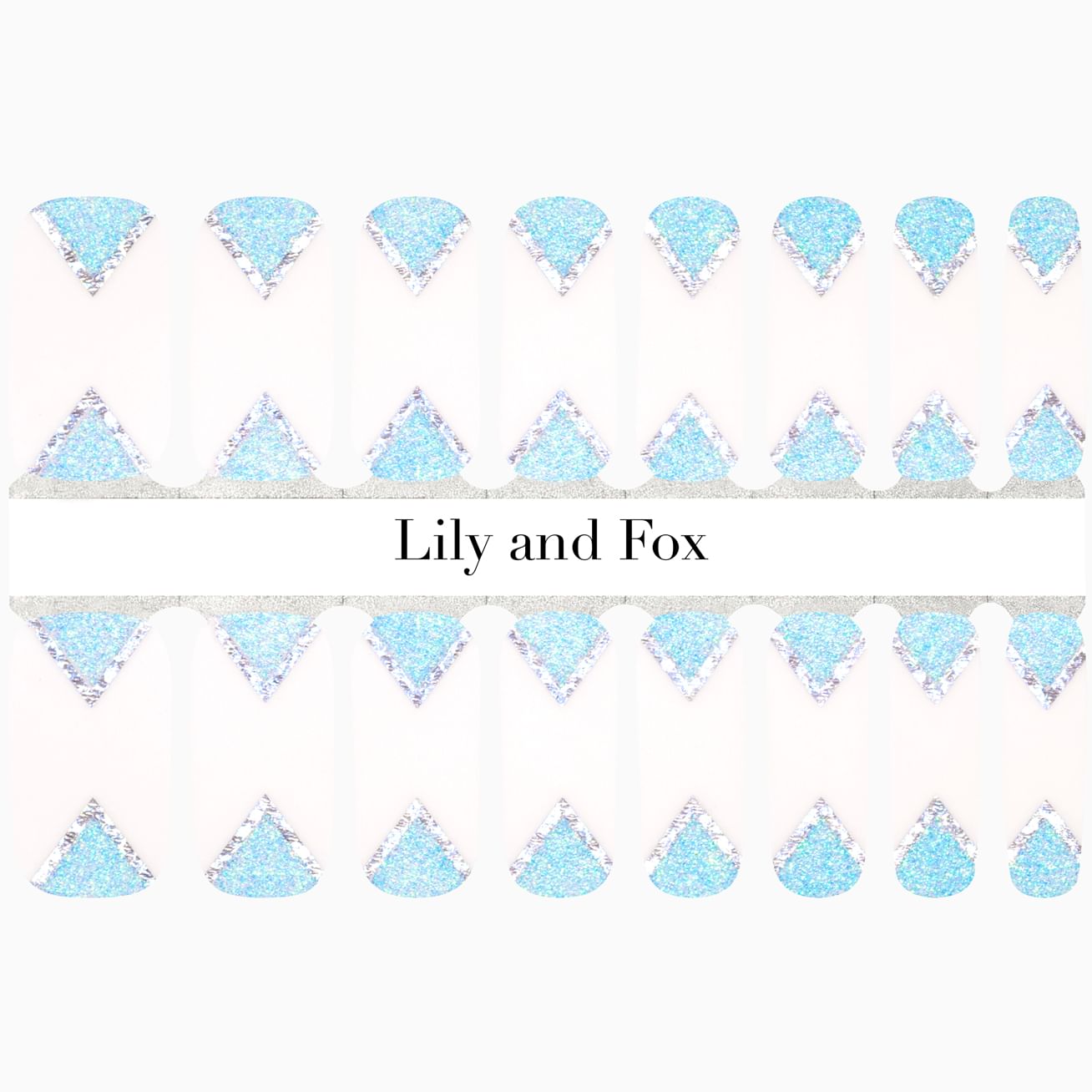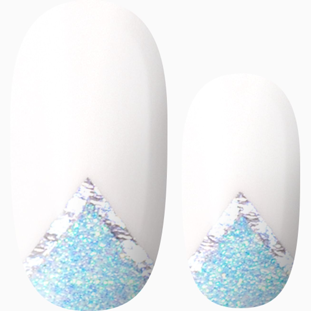 Frosted Beauty features multi-colored light blue glitter triangles at the cuticle topped with a metallic silver outline. Set against a glossy white background, this wrap set gives winter mountain feels, but mixed and matched with other sets, this look can be warmed up to celebrate summer or any other season. Protect the finish with a layer of top coat.
