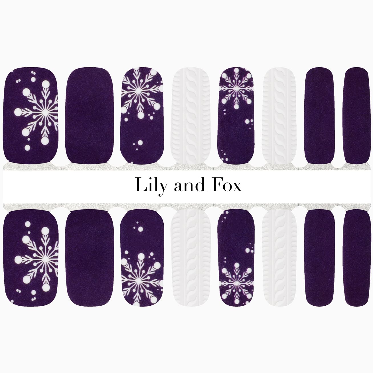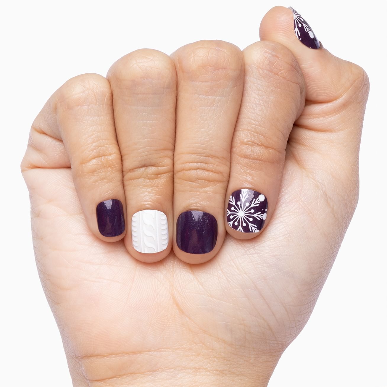 This wrap set will surely warm your heart with its cheerful white snowflakes against a deep purple background. The white-on-white accent nails whisper "sweater weather" with the subtle cable knit design. Perfect for long or short nails, this manicure can be applied in minutes and enjoyed for weeks.
